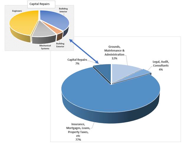 The rest is used for the maintenance and improvement of the buildings (plumbing, electrical, heating, etc.), capital work (roofs, new furnaces, sump pumps, foundation restorations, etc.) and capital planning, engineering and consultants.
